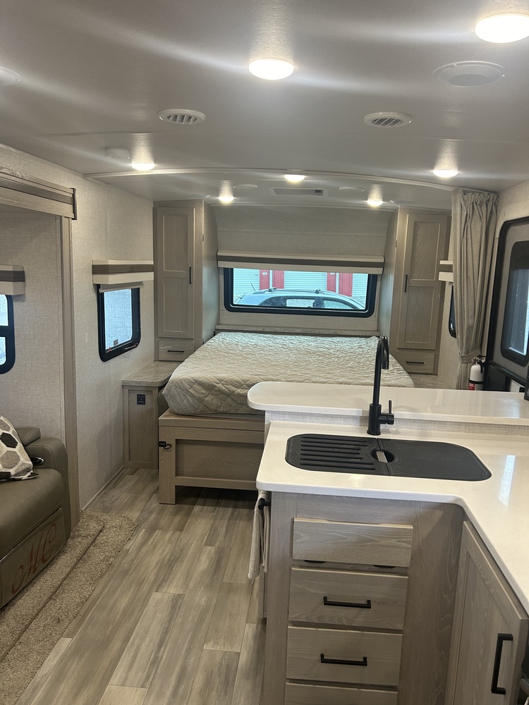 Immaculate trailer. Stored under cover. Murphy bed, theatre seats. Lots of counter space. Plenty of accessories. Kitchen 2 stool bar. Solar. Used less than 20 times. Outdoor gas griddle. Gas, electric fridge. Like new!!