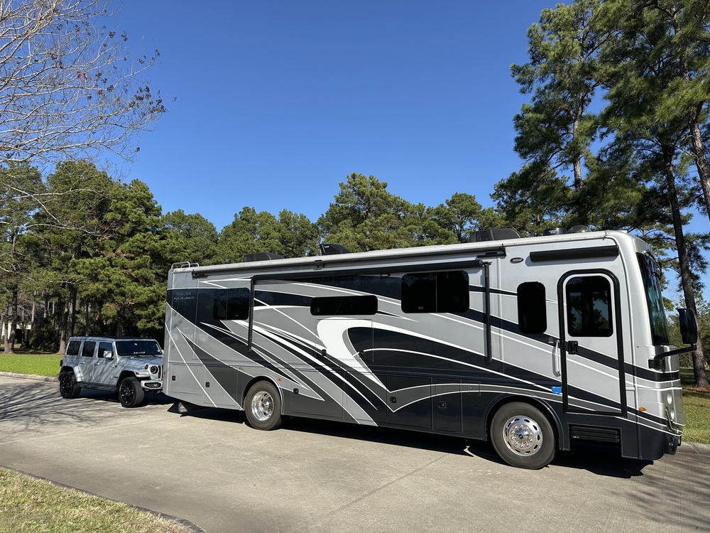 2023 Holiday Rambler Nautica 34RX - Better than new Luxury "diesel-pusher" is the perfect size to see State and National Parks. The Freightliner Custom Chassis, Cummins Diesel Engine and Allison Transmission guarantee one of the most solid platforms in the Class A motorhome industry. Standard features include Queen Bed plus convertible dining table, LED lighting, Residential style Stainless Steel Refrigerator, Convection Microwave & Induction Stove, endless hot water with the Aqua-Hot 250D, 6000W Onan Diesel Generator, 4 LED TVs, Fireplace, BrakeSync, Tire Pressure Monitoring, and many more luxury features. This coach also includes over $22,650 in options & upgrades, including: Stackable Washer & Dryer, Full Bay 90 Slide Tray, Motorized Power Cord Reel, Central Vac System, dual upgraded 15,000 BTU AC units, Floor Safe, Drop-Down Queen Bed, Motion Power Lounges, Pwr Passenger Seat w/Pwr Footrest, Connectivity Package, 300W Solar Panels, Satellite System, Safety Awareness Package & Mobileye® and more. Also comes with $22,222 in extended warrantees, coverages and safety features, including: Cornerstone Ultimate Svc Contract (5 yr extended warrantee), Platinum Ultimate Plus paint & interior protection, Tyron Run Flat Protection (a must-have safety feature @$3495), SafeRide Roadside Assistance, Tire Shield Road Hazard Agreement, and ECO Interior RV+ (MicrobeRepel). Just received complete 15,000 mile Freightliner recommended service (actual mileage 15,993) to engine and chassis, plus oil, filter and recommended svc to the Onan Generator. This motorhome is better than new as the engine and all mechanical, electrical and electronic systems have been tested and serviced to eliminate any of the small bugs that can arise from an undriven unit from the factory. The interior and exterior are beautiful and perfect. Sales Price: $229,900 Special Note: $1000 travel expenses provided for pickup or will consider delivering. Also, will consider selling the matching 2023 Jeep Wrangler 4-Door High Altitude with Air Force One Braking System (true proportional air braking) and the Blue Ox Towing system. Inquire about price if interested.
