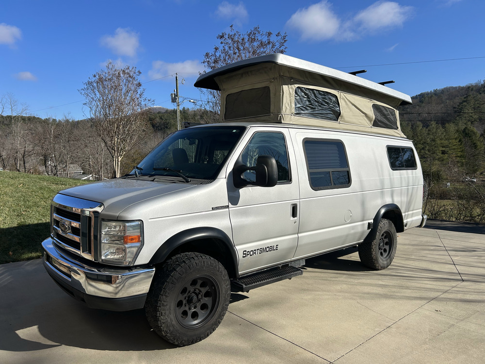 2010 Sportsmobile E-250 Camper. (Not a 4x4 but could be converted). This van features: NITO Ridge Grappler 265/70/17 tires, utility latter, roof rack with Thule storage topper, hitch receiver, fresh water storage/water pump with grey water tank, two RV batteries, shore line power connection, microwave and new Kenwood stereo with Apple CarPlay. The van is also outfitted with Sportsmobile original fabric shades, front window snap in curtain and swivel front seats. The lighting inside the van has been converted to LED fixtures and there are power side mirrors. I had Ford install their factory 2" leveling kit and all new shocks and leaf springs. Ford also sold me the factory rubber floor mats. The Fiamma awning is in perfect condition with no tears. This van came with 4 auxiliary factory switches in the dash board. I had an LED bar light added in the front bumper. There are three more auxiliary switches with fuses for more accessory lighting. For the safety of my children I added the Ford bench seat because it provided shoulder harness seatbelts. This bench seat could easily be removed and replaced with a forward facing seat. These vans come with steel mounting plates in the floor for forward facing rear seats. There are two mahogany tables with a freestanding aluminum base that can be used outside of the vehicle. The rear of the camper converts from a dining area into a king size bed configuration. These vans come with 3 upper bed panels. I had Sportsmobile send me a 4th panel to increase the upper sleeping area. I just had the oil changed, tires rotated, and an alignment done so it is ready to go cross country. I have the title in hand.
