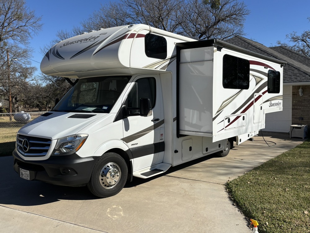 This is a class c , 24 foot Sun Seeker 2400WSD. A Mercedes diesel engine with 22485 miles. It is white, inside color is beige and beautiful cabinets throughout. The LP generator only has 3.40 hours, and runs perfectly. The dinette has been replaced with double seat couch that has legs lift. It has always been stored undercover. It has stabilizer jacks. It is in perfect condition, and looks brand new.