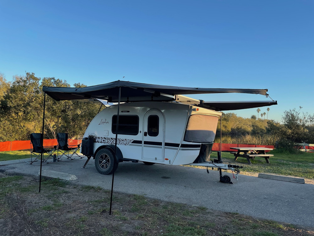 It has an integrated propane heater, air conditioning, 200Ah lithium battery, extra water, giant awnings, two TVs which operate on battery power, room for a queen size bed, and lots more.