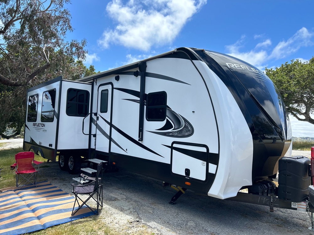 Head out to your favorite campground for a relaxing weekend with this 37 foot 2020 Grand Design Reflection travel trailer with three slides. Your kids will enjoy their own space with the rear bunkhouse for your down time while Mom and Dad will relax in the private front bedroom. Enjoy sitting outside under the lighted power sliding awning. Prepare your meals at the lighted full exterior kitchen which includes a gas burners, sink and mid-sized fridge while listening to your favorite music through outdoor speakers. After exploring the great outdoors, rinse off with the outdoor shower.Specs:-Three power slides create a comfortable space with ease.-TVs in the main living space. DVD player and radio in the main living room.-Kitchen with large fridge, gas stove/oven, microwave, -Stay cool with thermostat controlled A/C units in living room and master bedroom.Whether you are into cooking at the outdoor kitchen, relaxing under the awning or lounging inside watching the game, this trailer allows you to spend more time on relaxing with all the creature comforts of home.