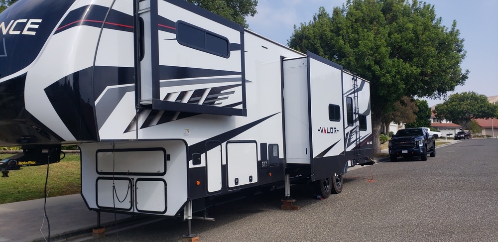 **NOTE: NOT SURE OF THE TRIM (OWNERS MANUAL WITH THE TRAILER WHICH IS IN STORAGE). I can get the trim # if someone wants it. This toyhauler trailer has been used 5 times. Never used to haul toys. It's like brand new. 3 Lithium batteries with solar panels (Renology solar power system) . Upgraded package. Three air conditioners, two bathroms, fold out back patio with enclosed awning. Has separate garage that converts to a bedroom with two drop down queen sized beds (garage has A/C) with flat panel T.V. Electric fireplace. Total of three flat screen T.V's. Ceiling Fans. Kitchen has island. Three slide outs. Washer/dryer hookups (garage and master bedroom). Large couch with two power recliners. Large lit pantry. Double door refrigerator - stainless steel. Lots of storage. Extra sleeping bunk. Trailer is dual axle - 8 lug wheels. Fuel station. Air compressor. External shower. Top of the line water filtration system. Auto leveling system with 6 jacks. High clearance chassis. Extra large gray and black water tanks. Three power awnings. Perma Plate Paint/Fiberguard/leatherguard/Vinyl Awning Coverage.Lots of outside storage. Led outdoor trim lighting. trailer cover included. Overall condition: Excellent. Price includes full detail before new owner takes possession. This is a beautiful trailer. We just can't get the time to use it (small business owner). Originally paid $121,039.00