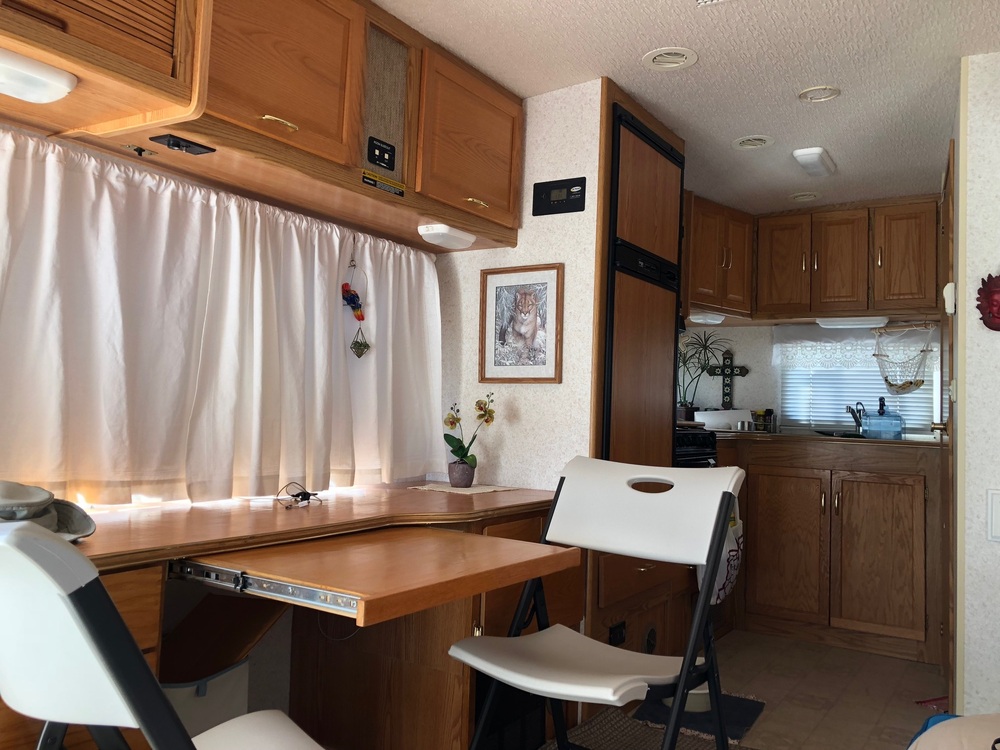 Living area: Jackknife sofa that opens into a double bed. Sits across from 6" office credenza with two desk drawers and extra large storage box. Remodel added 24' width.