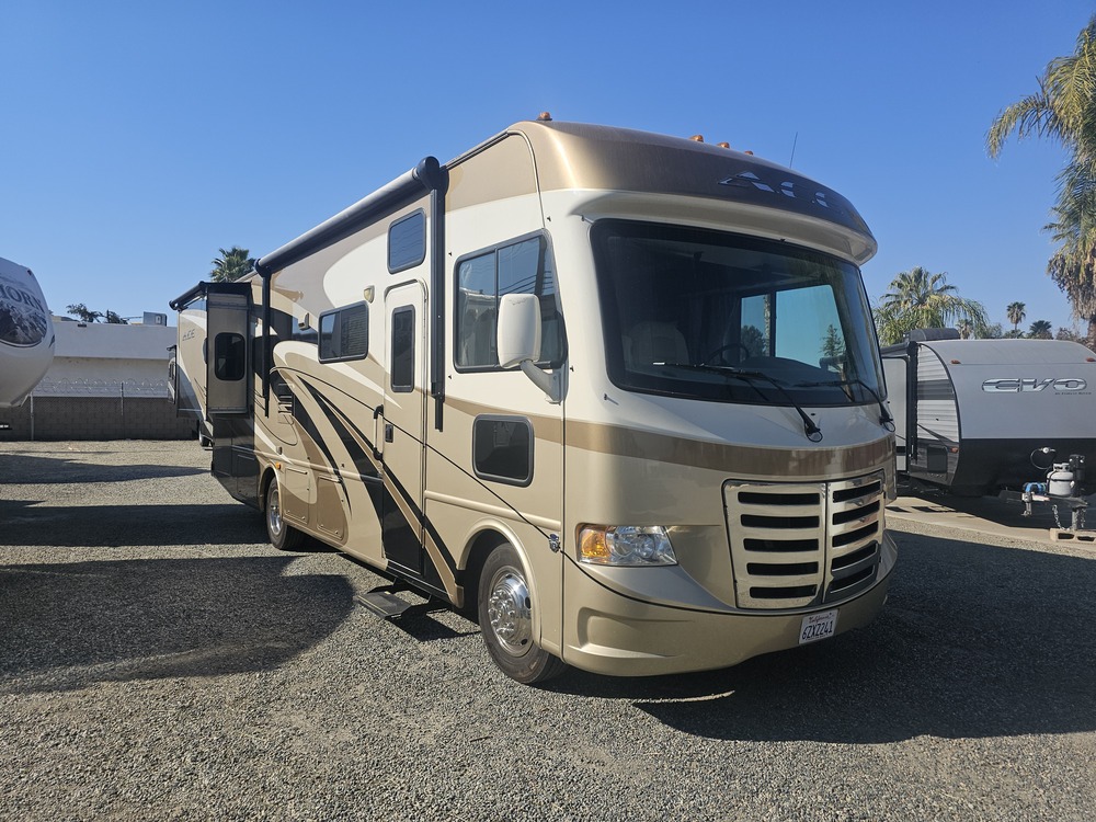 Dbl slide Class A M/H, front overhead bed, large slide w/couch & dinette, mid-kitchen, split bath rear queen bed slide, sleeps 7.