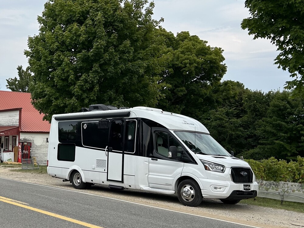 Let me tell you a bit about our LTV RL. Its sharp-looking Euro Sport exterior is in excellent condition, because we've stored it inside. Its remote key fob makes entry, including the coach entry door, as easy as pushing a button. This RV drives like a comfortable SUV. Its efficient 3.5L Eco-boost V6 gas-powered engine provides lots of power, yet gives good gas mileage. Its traveled 28,500 miles. When required, our Wonder is easier and less expense to service because is built on a Ford Transit chassis. Power is provided by 200Ah Dragonfly lithium batteries, 2000W Xantrex inverter, and 400W rigid solar panels as well as the 4000W Onan gas generator.