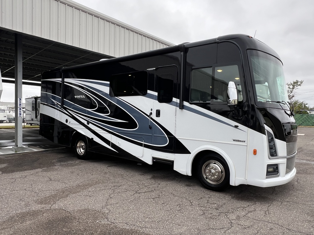 2023 Winnebago Vista 29V is equipped with:- Cooling up grade which includes two ducted A/C units w/heat pump- 5500 watt Onan generators- 3 burner gas range with oven- Microwave- Electronic stability control on new V 8 chassis- Full body paint with protective mask- Solar panel battery charger- Loft bed- Wifi router signal booster- 32" tv in bedroom- 42" tv in living area- Rear monitor with side cameras- Trailer hitch- Stainless wheel liners- 17' Power awning- Slide topper cover- Power roof ventilator in bedroom and galley- Automatic hydraulic leveling system- Power step- Out side galley with gas grille hook up, refrigerator, & sink - Out side tv and exterior speakers- Power mirrors- Work station on passenger seat- Compressor driven ref/freezer- 1000 watt inverter- External shower- Booth dinette- CO Detector- Furnace- NonSmoking Unit- Water heater- Full-length driver's side power slide out- Tryon Blowout Protection- King Bed with upgraded mattress- 50 AMP- Starlink Satellite Equip Included