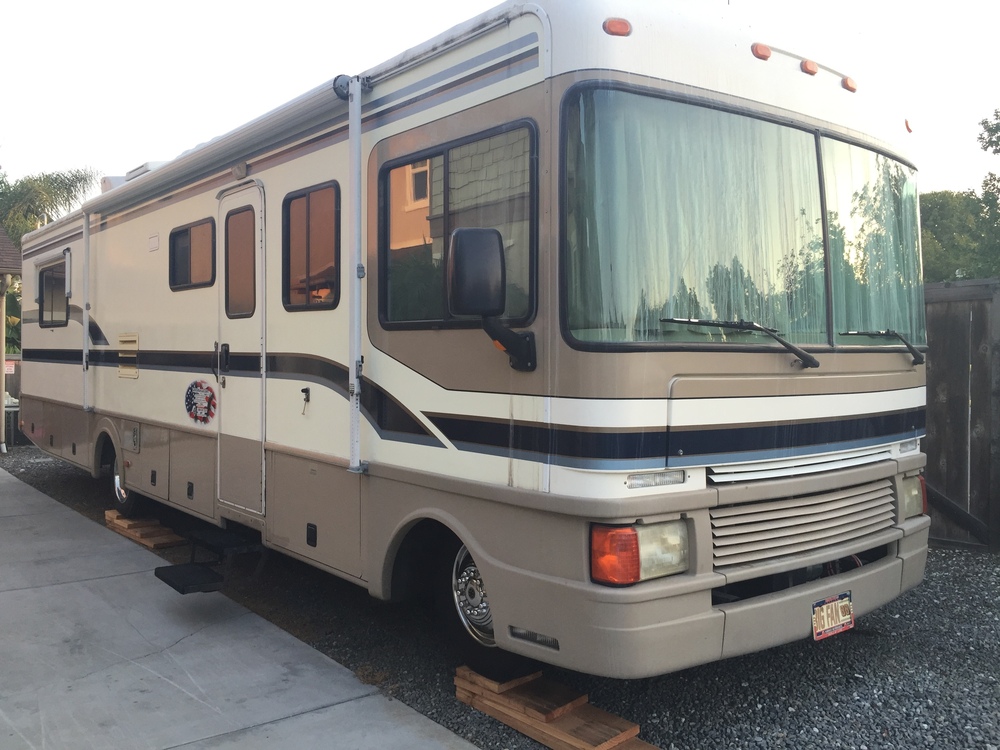 1998 34J Fleetwood Bounder. We are the 2nd owner of this Used 1998 Fleetwood Bounder 34J has an updated 32 TV above the cab, a single fold out dining table single chair, a large sleeper sofa, and a booth dinette in the living area. Tires are about 4 years old and only have less than 500 miles on them. Brakes are newer and low mileage on new brakes. 7kW Onan Generator. Overall well maintained and had a new roof and new stickers put on about 10 years ago. The kitchen has a double bowl sink, a 3 burner stovetop with an oven, a microwave, a refrigerator and freezer. At the mid section is a spacious bathroom with a shower and tub combo. The tub is good sized for kids to take bath. The bedroom has a walk-around queen bed with nightstands, a TV, and a wooden closet. The interior is very clean and in good shape. Outside you will find an awning, a backup camera, a roof ladder, and lots of storage compartments. Currently the registration is in need of a smog check to get current registration tag. It will pass smog as we have not really used the RV for the past 5 years or so. This is a great RV and Ready to give you years or family adventures as it did for me and my family. Any potential buyer shall provide and show buyers drivers license and proof of auto insurance before the test drive. Forms of payment include cash or wire transfers are acceptable and the vehicle will not be released until the money is deposited in my bank account. Serious inquiries only - Send me a message through the RV Trader Portal and I will get back to you soon. I am not in a rush to sell and only looking for serious buyers and no scammers - don't waist my time. Ready for a new young family to start making memories!!I have three children and we have been many places and made many good memories. Selling now cause hard to find the time for all of us to get away and all three kids are adults and busy. We have a vacation home as well and have not really used the RV in the past 4-5 years. This has been a great running rig and it has never broken down on a trip or left us stranded. Rear roof ladder has some damage where I backed up to close to the house. Graffic Stickers have some cracking.