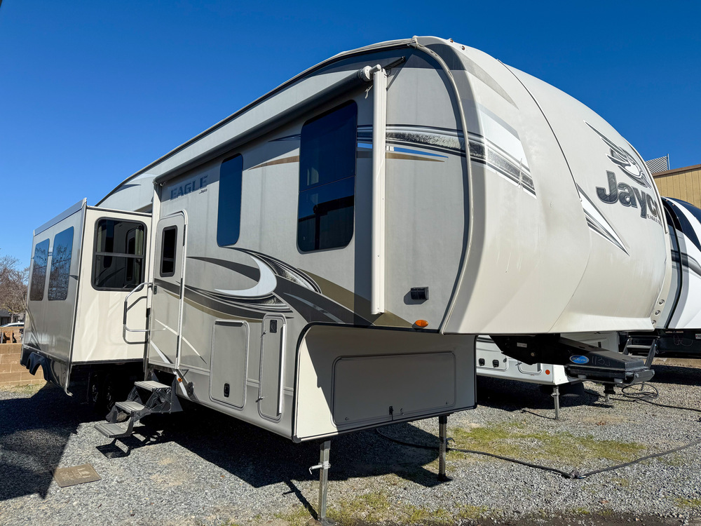 2018 JAYCO EAGLE 325BHQS BUNK HOUSE 5TH WHEEL TRAILER! 38' OVERALL, 11,285LBS DRY AND 13,750LBS LOADED. 4 POINT AUTO LEVELING SYSTEM, 4 SLIDES, POWER AWNING, OUTDOOR KITCHEN AND WIRED FOR SOLAR. GREAT FLOORPLAN, KITCHEN ISLAND WITH PANTRY, PRIVATE REAR BUNK ROOM THAT SLEEPS 4, RECLINERS, DINETTE, PRIVATE BATHROOM WITH GLASS SHOWER. QUEEN WALK AROUND BED. ONLY $29,885 FINANCING AVAILABLE AND TRADE-INS WELCOME! 916-747-1936