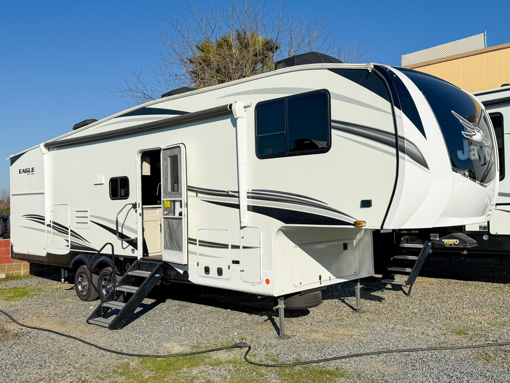 2021 JAYCO EAGLE HT 29.5BHDS BUNKHOUSE 5TH WHEEL! AUTO LEVLERS, 2 A/C, 50 AMP SERVICE, OUTDOOR KITCHEN WITH FRIDGE, POWER AWNING AND SOLID STEP ENTRY. PRE-WIRED FOR SOLAR. GREAT SIZE AT ONLY 34' OVERALL AND 11,250LBS LOADED WEIGHT - UNDER 10K DRY. MODERN INTERIOR, HUGE DOUBLE BUNK BEDS, FIREPLACE, GLASS SHOWER AND QUEEN BED WITH MEMORY FOAM MATTRESS. ONLY $29,995 FINANCING AVAILABLE AND TRADE-INS WELCOME! 916-747-1936