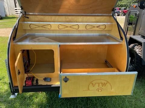 This is a Vintage Trailer Works XTC off-road teardrop trailer - base package. The features are listed in one of the photos, plus, I added a 100Ah LiFePO4 battery. You can run all the lights, fan, and a 12-volt 50L refrigerator for several days in high heat. Interior and exterior are pristine; I've taken it on a handful of camping trips. There is a fold-out, queen-size mattress, inside, and I have never had an uncomfortable night of sleep on it. There is ample storage space, inside, and in the galley, on the tongue, and up top, on the roof rack. With the addition of a small solar panel, awning, maybe a shower system, and chemical toilet, this would be quite comfortable for two people to take into the wilderness and not see a soul for quite some time. I have hauled it with a Jeep Cherokee with 4 cylinders, which is plenty of power for flat Ohio, but if you plan on taking it through steep mountain roads, I'd suggest something with 6 cylinders.