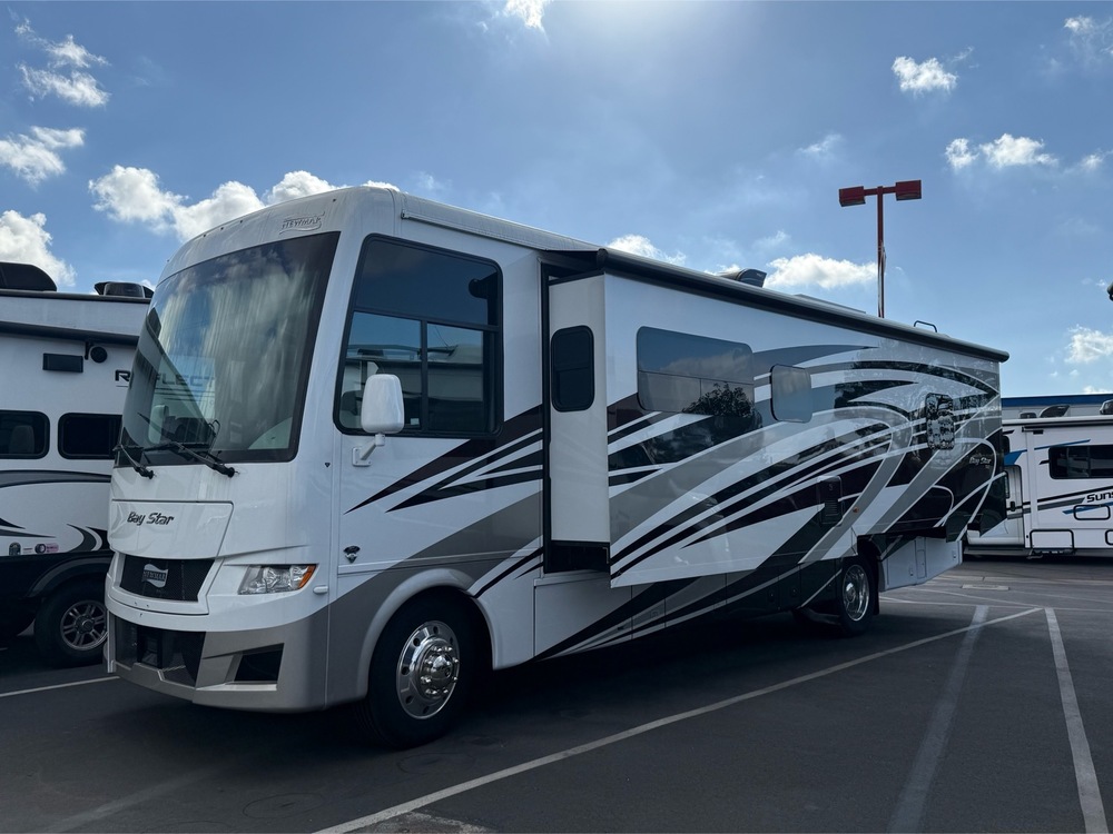 For quickest response call Kevin Fossum at Mike Thompson's RV 24/7 @ 714-660-7625 (NOT A TEXTABLE NUMBER)! SUPER LOW MILES – SOLAR PACKAGE! The 2024 Newmar Baystar 3225 is a class A motor home with three large slide outs. The bedroom has a king bed and front has a drop down bed. It has all of the options you would expect including; LCD TVs, electric awning, plenty of storage and so much more.