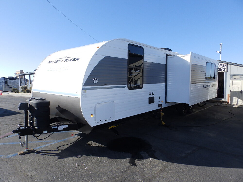WE DO NOT CHARGE FOR PDI OR PREP FEE LIKE MOST OTHER DEALER'S! NEW 2025 FOREST RIVER SALEM 22VERANDA, REAR PATIO MODEL, FRONT WALK AROUND CUSTOM KING VERSA-TILT BED (BED CAN BE POWER ADJUSTED), 34 FT 9 INCHES LONG PULL TRAVEL TRAILER, DRY WEIGHT ONLY 8165 LBS! ***UPGRADED 200 WATT SOLAR PANEL***, UPGRADED POWER STABILIZER JACKS IN ALL 4 CORNERS, UPGRADED POWER AWNING WITH LED BLADE LIGHTING, UPGRADED POWER TONGUE JACK, 1 LIVING ROOM SLIDE OUT, ***UPGRADED EXTERIOR SHOWER***, UPGRADED DUAL 7.5 GALLON LP PROPANE TANKS, SPARE TIRE, LARGE FULL PASS THRU EXTERIOR STORAGE, ***UPGRADED SOLID-STEP ALUMINUM ENTRY STEPS ON MAIN DOOR***, UPGRADED LARGE ENTRY DOOR GRAB HANDLE, ***UPGRADED TANKLESS WATER HEATER***, BLACK TANK FLUSH, UPGRADED 12 VOLT BATTERY DISCONNECT SWITCH, JBL AM/FM/BLUETOOTH PLAYER WITH INTERIOR/EXTERIOR SPEAKERS, REAR SLIDING GLASS DOOR TO EXTERIOR PATIO, ***EXTERIOR FRIDGE, SINK, AND COOKTOP ON PATIO***, SOFA/CHAISE SLEEPER ACROSS FROM LARGE 50" LED TV AND FIREPLACE IN LIVING ROOM, LARGE 2 DOOR 12-VOLT 10 CUBIC FT REFRIGERATOR/FREEZER, 3 BURNER STOVE TOP WITH GLASS COVER, OVEN, MICROWAVE, LARGE PULL-OUT PANTRY, SLEEPS 3, FRONT PRIVATE BEDROOM WITH WALK AROUND VERSA-TILT CUSTOM KING BED, UPGRADED ROLLER SHADES, LIVING ROOM SLIDE OUT WITH DELUXE WOOD TRIM ON INTERIOR SLIDE, LARGE PASSTROUGH PRIVATE BATHROOM, VANITY MIRROR WITH BACKLIGHTING, LARGE SHOWER, SKYLIGHT OVER THE SHOWER, LOTS OF STORAGE IN COACH, ECLIPSE INTERIOR FABRIC, UPGRADED 15,000 BTU DUCTED A/C, DUCTED HEATER, 50 AMP SERVICE, THIS UNIT IS LOADED! WE DO NOT CHARGE FOR PRE-DELIVERY INSPECTION (PDI), SAFETY INSPECTION, OR WALK THRU. MOST OTHER DEALERS CHARGE ADDITIONAL FEES FOR PDI UP TO $1895 EXTRA), YOU BETTER ASK! (IF YOUR SHOPPING AROUND FOR PRICES, MAKE SURE COMPARE ALL THE EXTRA OPTIONS OUR UNIT HAS TO THEIR UNIT). ANY GOVERNMENT FEES, SALES TAX, REGISTRATION FEE, DEALER, LICENSE FEE, FINANCE CHARGES, ANY DEALER DOCUMENT PREPARATION CHARGE, AND ANY EMISSION TESTING CHARGE, ARE ADDITIONAL TO THE ADVERTISED PRICE.