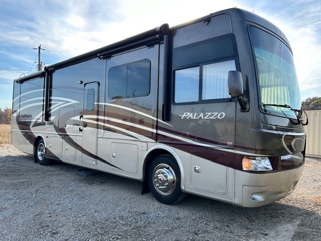 The Thor Motor Coach Palazzo 35.1 is a Class A motorhome with 3 slides that is perfect for those looking to travel in comfort. This RV features a spacious living area with plush, comfy sofa recliners, upper cabinets above the sofa and drivers area, there is a bed over the driver's area (which can be lowered to use), a 48" television on a televator, table with two chairs (2 extra to seat 4), deep drawer and two cabinets below the televator. Two tall cabinets with shelving is in the coach entry area with another cabinet next to the stairs for shoe/boot storage.There is a fully equipped kitchen (house size refrigerator/freezer), microwave with convection oven, propane stove and split bowl sink. A large pantry located in the hallway holds a large amount of dry goods.The cozy bedroom has a new King mattress with matching bedspread, shams & window treatments, smaller TV and plenty of folding and hanging storage. A stackable washer and dryer is onboard to keep up with laundry. Sun and blackout shades are on all windows. The bath is adequate with a small sink, RV style commode and large shower with new shower head. The vanity has storage below the sink with a good amount of cabinet storage above the sink as well.The Palazzo 35.1 is also built for performance and reliability. The powerful 340 HP Cummins motor and Allison transmission on the Freightliner Chassis ensure a smooth ride. New Chassis and coach batteries were added in 2024. This coach has new shocks and new Michelin tires! The fresh water holding capacity is 95 gallons with a new high volume water pump. The Onan generator has less than 300 hours run time. The engine and generator were just serviced.This coach has been gently used, is super clean and ready to travel in..