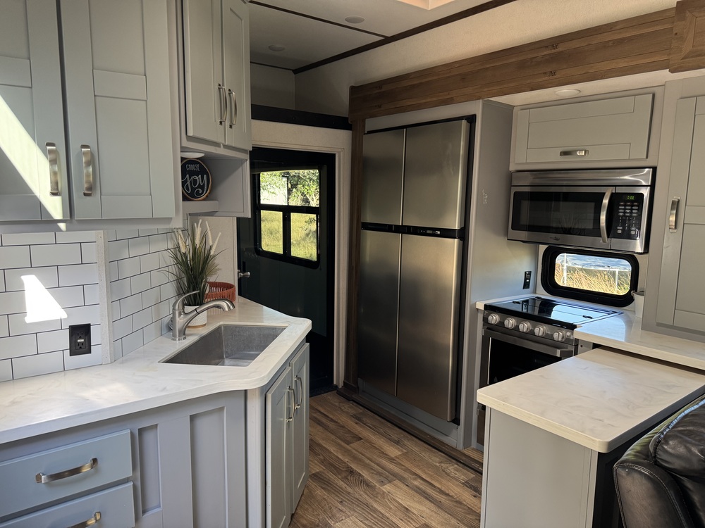 •Modern Kitchen: Full-sized refrigerator, upgraded faucet, and a washer dryer combo--perfect for families on the road.