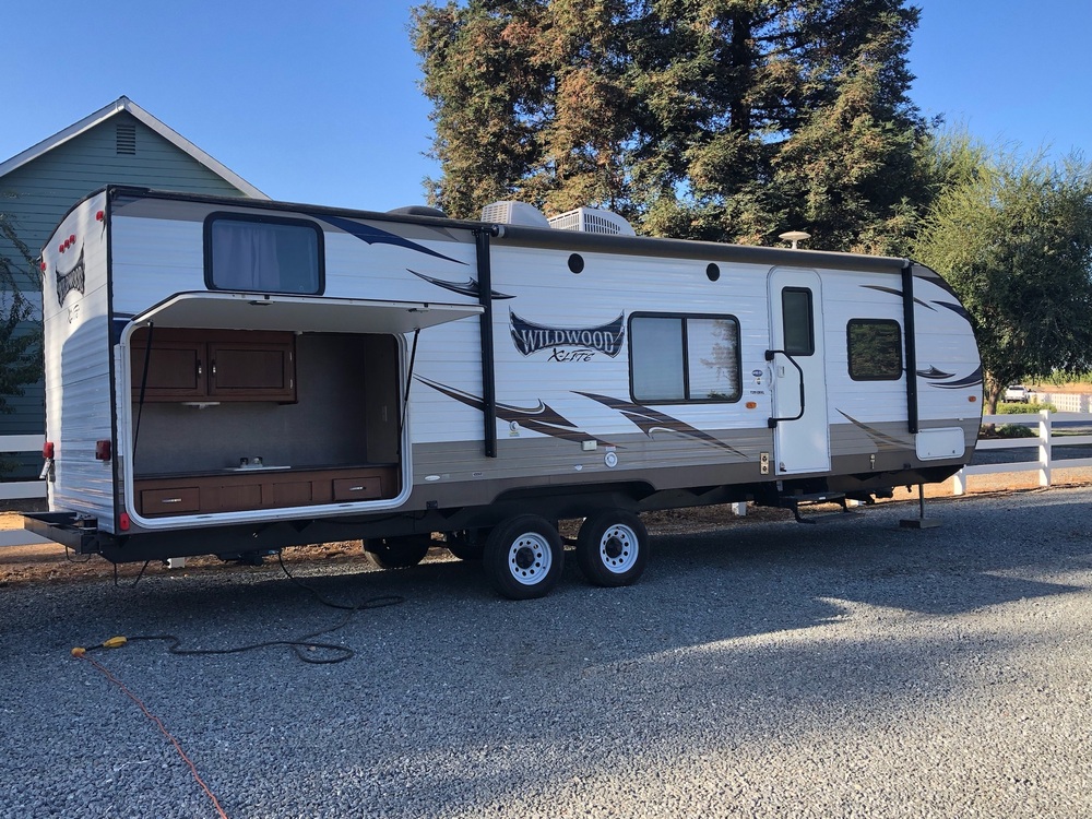 Features: Sleeps 8, 1 Slide, Bunkhouse, Outdoor Kitchen, 32ft Long, 5,970 lbs, Harbor, Tiffany Leather. Enjoy camping with the whole family, or even a few extra guests in this Wildwood X-Lite travel trailer by Forest River. This rear bunkhouse model is a terrific option for kids an offers ample space with a large slide out. The master bedroom is located to the right as you step inside. Sliding doors are located on both sides of the entertainment center so you can completely close it off for privacy. There are wardrobes on both sides of the queen bed, plus a storage shelf over the head of the bed.This trailer was used as primary living unit for 3-years and seen little road wear. New battery, new thermostat control, extra-large 30-gallon propane tanks, excellent tire tread. Price negotiable.