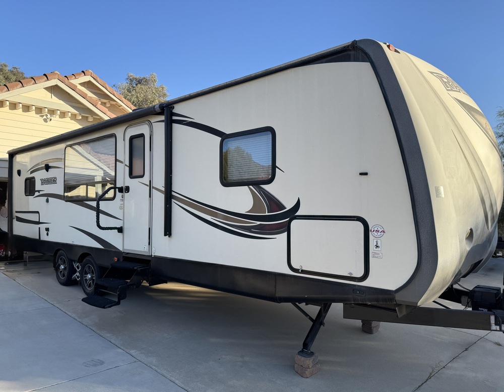 It is the perfect rv for long-term living. Spacious open living room /kitchen /dining area. Comfortably large bathroom. Arrangement with recliners across from pull out convertible sofa (after market upgrade) is perfect for visiting with friends and family. Front kitchen has plenty of counter space. Bedroom has enough room to walk entirely around the queen memory foam mattress bed. Shower has curtain, so no banging into a shower door which limits space.