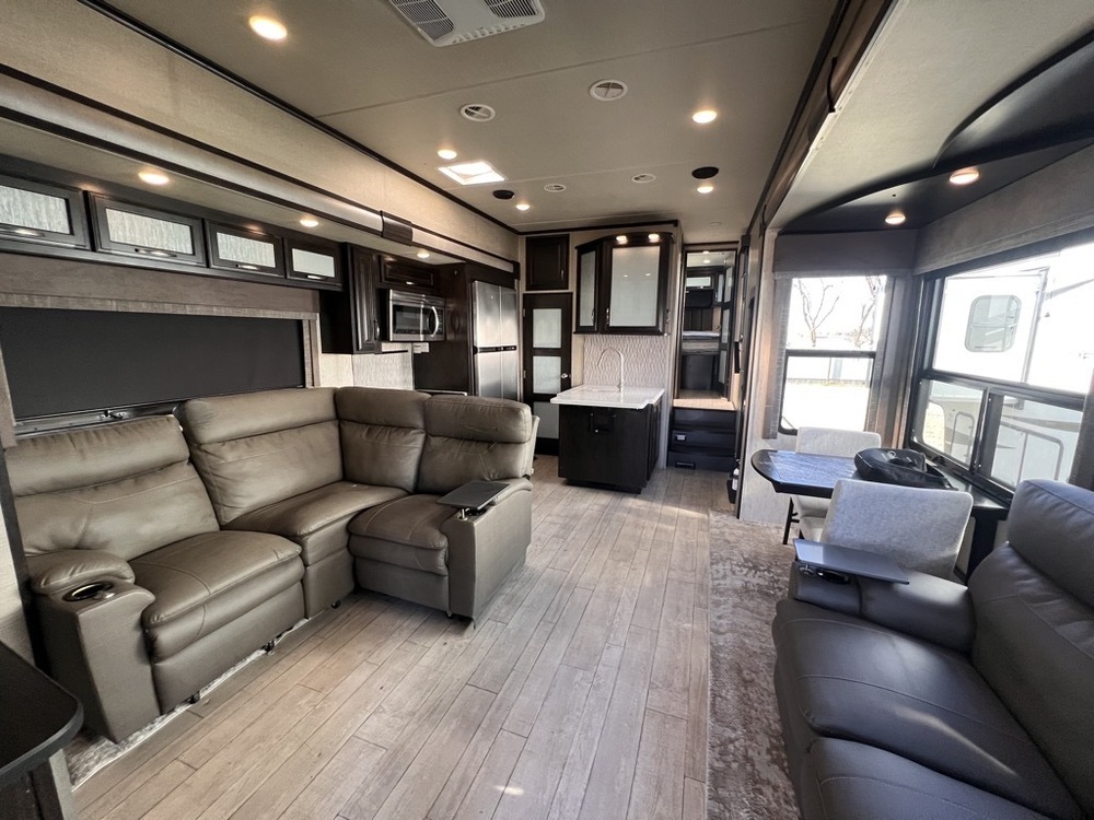 2018 GRAND DESIGN MOMENTUM 395M 3 SLIDES, ISLAND KITCHEN, MUST SEE, FREE DELIVERY & SETUP!! Length 43FT -GREAT FLOOR PLAN. WASHER/DRYER Connections. 3 SLIDES, 2 PRIVATE BEDROOM UNIT WITH 2 BATHROOMS. LOFT & Sofa Sleepers. 2 Recliners. Full Size Spacious Living Room With a Great Kitchen. An Entertainment Area with Smart TV. Fireplace. BIG Bathroom. Couch That Converts To Bed. Lots Of Storage. 2 Huge Awnings With LED Lighting. Sleeps 10, with a Memory Foam Mattress in the Private Master Bedroom, 3 COLD A/C. Onboard ONAN Generator. 12ft Toyhauler box. Super Clean. SUPER NICE TRAILER. 15400lbs UVW. 50AMP POWER. OUR PRICE $43990. SEVERAL SUPER NICE RVS TO CHOOSE FROM. We are located in Mansfield TX on Business 287. We show Rv's 7 Days A Week Call BRET 817-805-0067 or AMY 817-658-4633 FREE DELIVERY AVAILABLE TO ALL 48 STATES. WE INSPECT & GO THROUGH ALL TRAILERS TO INSURE OUR CUSTOMERS ARE 100% SATISFIED.