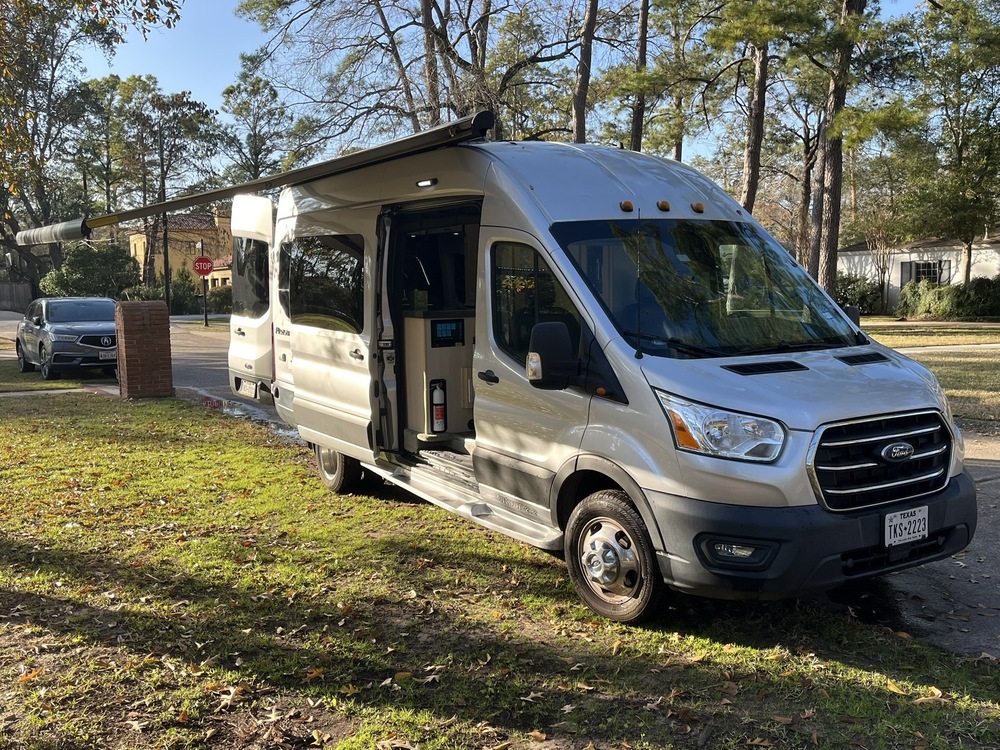 Standard features of the Ontour 2.2: Designed with both functionality and aesthetics in mind, the Pleasure Way Ontour boasts a spacious interior layout that can comfortably accommodate up to four passengers. Based on the Ford Transit chassis (resulting in lower maintenance costs and a broader dealer network than the diesel alternative), the well-appointed cockpit features all the modern amenities you need for a smooth and enjoyable driving experience, including a state-of-the-art infotainment system, navigation tools, and user-friendly controls. The living area is thoughtfully designed to maximize space and comfort, with plush seating, ample storage, and premium finishes throughout. The convertible sofa bed effortlessly transforms into a queen bed with the push of a button, while the fully-equipped kitchenette with a convection microwave, cooktop, fridge, and sink allows you to whip up delicious meals on the go. It also includes a full bath. From an electric standpoint, the Ontour includes lithium batteries, a 2000W inverter, 3 solar panels, and a 4.8KW generator (all controlled by the state-of-the art panels located at the entrance and an the rear of the van in the living space) to allow you to be off the grid for extended periods. It also includes a power awning with led lights to have shade during hot days, rear and side screens to allow air flow but not bugs, exterior spray port to rinse after a day in the beach, LP quick connect for a bbq or firepit, Bose soundbar with bluetooth for the best music, blackout roller-shades with magnetic catch throughout for a complete privacy and (except on chassis that has magnetic covers for the windows).