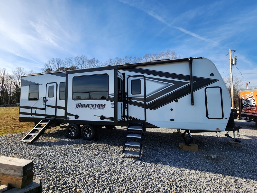UPGRADES: I have put several thousand dollar's worth of upgrades into this GD Momentum 31G. WE USED/CAMPED IN IT ONE (1) TIME. Replaced all the manual roll-up fans (4) with new MaxxAir Deluxe 10-speed fans with remotes (can push air in or out), Soft Starts installed on both Coleman A/Cs, Lippert fold up stairs at both doors with lights underneath and also SEADEK pads on steps themselves, Progressive EMS system HARDWIRED in the RV (Surge Protector), New lithium capable Progressive Dynamics converter installed, New 12VDC 100Ah Battle Born battery with metal covered case, Upgraded to 2- 30LB tanks for propane, New Stoett Industries 71x36 shower door system installed, Upgraded Furrion Tankless water heater to a Ranein 65k BTU Tankless W/H, New mattress ($1,000K) slept on once, B&W Continum sway system and Onboard 5500W Generator.