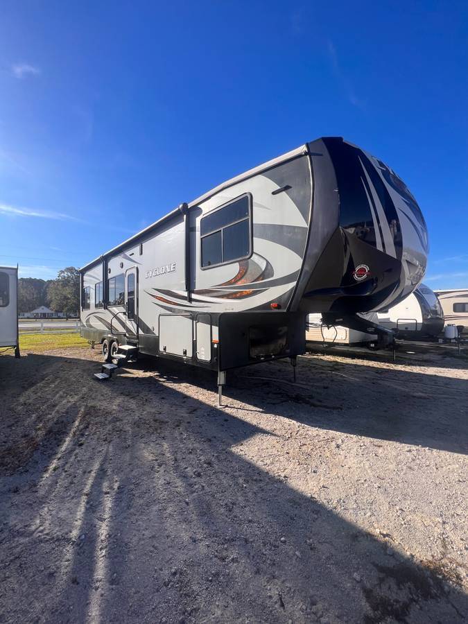 This Heartland Cyclone 3418 toy hauler fifth wheel will certainly maximize your fun with 18' of cargo hauling space, and all the amenities you need to enjoy your time relaxing inside too! This unit features a rear ramp door to make loading and unloading a breeze. The dual electric queen beds with convertible sofas allow you to take along a whole group of friends! Enjoy the built in storage box, and two lounge chairs in the cargo area. Enter the main living area where you will step up to a kitchen, and front bedroom and bath area. The kitchen offers a large counter top with double kitchen sink straight ahead of the entry door. There is a road side slide that offers a refrigerator, pantry, and three burner range. To the right of the entry door you will find a closet. Next, there is a bath with an angled shower, toilet and sink. Pass all the way through with a convenient second door to the front master bedroom which features a king bed with storage on either side, and a slide out wardrobe with drawers, plus plenty of room to hang your clothes.