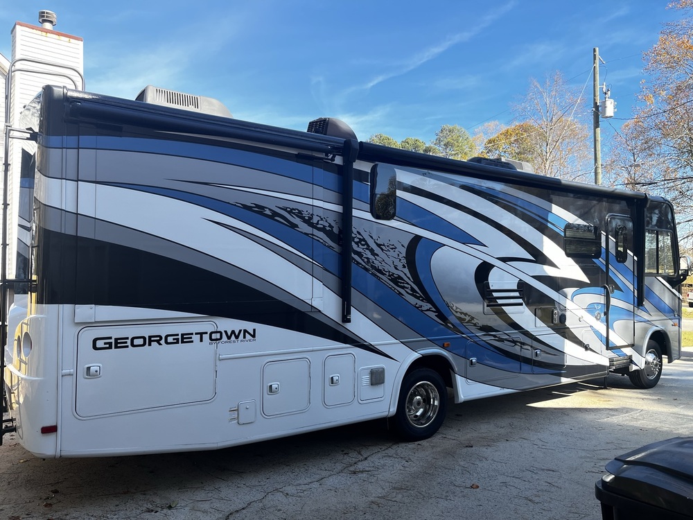 The Forest River Georgetown 5 Series GT5 31L5 is a luxurious Class A motorhome that offers the ultimate in comfort and convenience for your travels. This 2019 model has a mileage of 12,816, it has been well-maintained and is ready for your next adventure. The Georgetown 5 Series GT5 is known for its spacious and well-designed interior, with plenty of room for you and your family to relax and enjoy the journey. The layout of the 31L5 trim is thoughtfully designed, with a living area that includes comfortable seating, a dinette, and a well-equipped kitchen.The master bedroom features a cozy king-size bed, plenty of storage space, and a private bathroom with a shower. There is also an upper pull down bunk area for additional sleeping space, making this motorhome perfect for families or larger groups. Outside, the Forest River Georgetown 5 Series GT5 is equipped with all the amenities you need for outdoor living, including an awning, exterior entertainment system, and plenty of storage compartments for all your gear. The powerful engine and smooth handling make it easy to drive and maneuver, whether you're cruising down the highway or navigating tight parking lots. Added steering stabilizer. Overall, the Forest River Georgetown 5 Series GT5 31L5 is a top-of-the-line Class A motorhome that offers luxury, comfort, and convenience for your travels. With its spacious interior, well-appointed features, and reliable performance, this motorhome is sure to provide you with many memorable adventures on the road.
