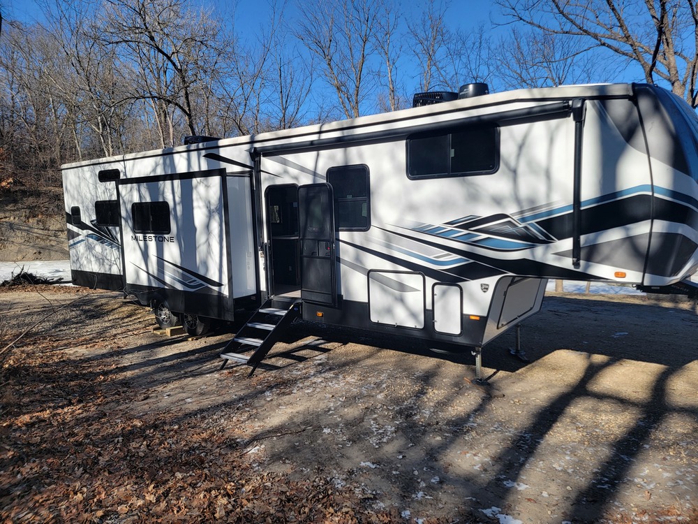 This is a MUST see spacious and Luxurious camper with a ton of full size space and storage! Never been slept in and ready to WOW in the campground of your choosing!Length43.4 ft. (521 in.)Width8.07 ft. (96.8 in.)Height13.33 ft. (160 in.)Interior Height6.36 ft. (76.3 in.)Number Of Fresh Water Holding Tanks1Total Fresh Water Tank Capacity65.0 gal.Number Of Gray Water Holding Tanks1Total Gray Water Tank Capacity45.0 gal.Number Of Black Water Holding Tanks1Total Black Water Tank Capacity90.0 gal.Number Of Propane Tanks2Total Propane Tank Capacity14.2 gal.Total Propane Tank Capacity60 lbs.Body MaterialAluminumSidewall ConstructionFiberglassNumber of Slideouts4Number of Awnings1Awning Length17 ft. (204 in.)Power Retractable AwningYesLeveling Jack TypeFront Power / Rear PowerKitchen LocationCenterLiving Area LocationCenterRefrigerator SizeFull-SizeMax Sleeping Count8Number Of Double Beds1Number Of Queen Size Beds1Number Of King Size Beds1Number Of Convertible / Sofa Beds1Master Bedroom Flooring TypeVinylMaster Bedroom Door StyleFull Sliding DoorFull Size Master Bedroom ClosetYesBunkhouseYesNumber Of Bathrooms2Bathroom Flooring TypeVinylBathroom LocationRear / CenterAir Conditioning TypeAutomaticAir Conditioning 42,000 BTUs*Heater TypeAutomaticHeater35,000 BTUsWater Heater Tank Capacity0 gWater Heater Pump Power ModeElectrical / PropaneTankless Water HeaterYes