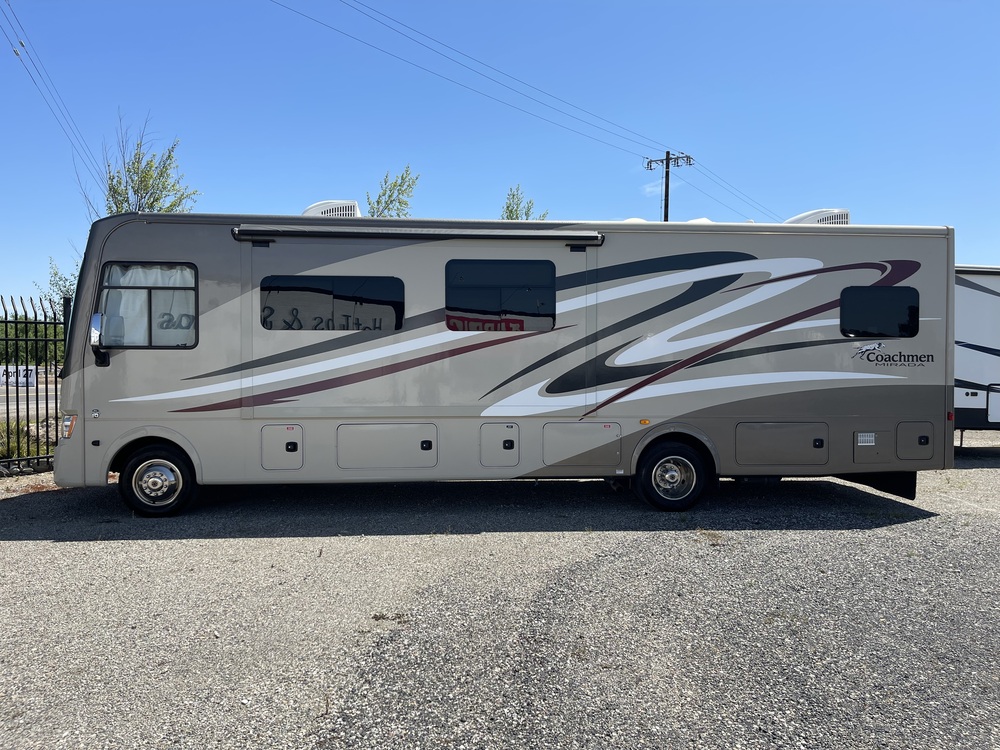 The Coachmen Mirada 32UD is a Class A motorhome that exudes luxury and comfort. This model, from the year 2015, boasts a mileage of 30,000 miles, indicating that it has been well-traveled but still has plenty of life left. With Coachmen's reputation for quality and attention to detail, you can trust that this motorhome is built to last.The exterior of the Coachmen Mirada 32UD is sleek and modern, with a design that is sure to turn heads wherever you go. The spacious interior is designed with comfort in mind, featuring ample seating, sleeping, and storage options. Whether you're taking a weekend trip or embarking on a cross-country adventure, this motorhome has everything you need to make your journey a memorable one.The Coachmen Mirada 32UD comes equipped with all the amenities you could want in a motorhome, including a fully functional kitchen, bathroom, and entertainment system. The living area is perfect for relaxing after a long day on the road, with plush seating and a flat-screen TV for movie nights.Safety is a top priority in the Coachmen Mirada 32UD, with features such as airbags, anti-lock brakes, and a backup camera to give you peace of mind while driving. The powerful engine and smooth handling ensure a comfortable ride, whether you're cruising down the highway or navigating tight city streets.Overall, the Coachmen Mirada 32UD is a top-of-the-line Class A motorhome that offers the perfect blend of style, comfort, and performance. With its impressive features and reliable construction, this motorhome is sure to provide you with years of enjoyment on the open road. Also this beautiful RV has been stored in a shop and not left outside so hardly no aging unless when traveling. and the roof is perfect.