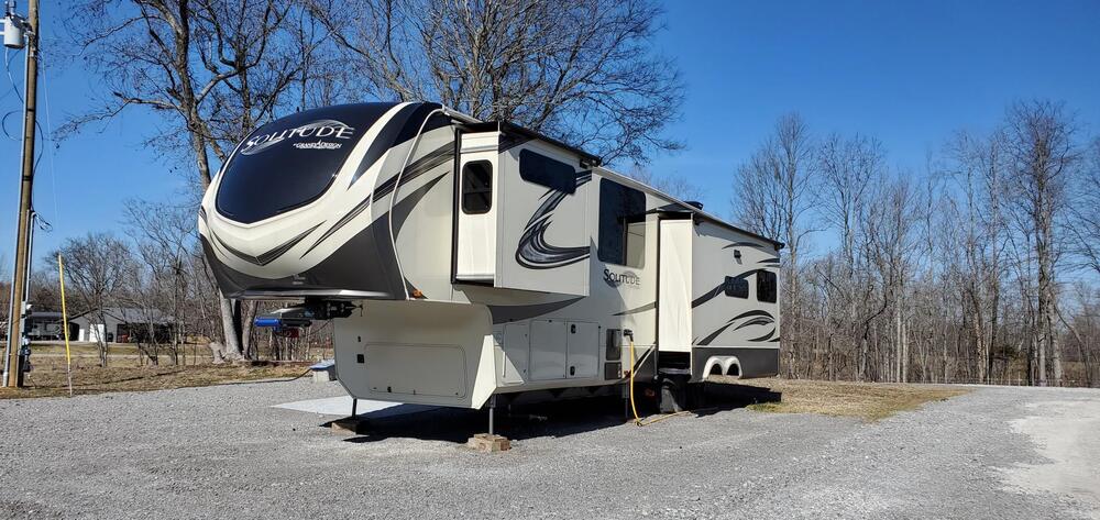 2020 Grand Design Solitude 385GK-R. Linen Decor interior. Solitude "Peace of Mind" package. Residential Living Package (washer dryer and dishwasher hook up). Weather Tek package. 12V Tank Heaters. 18' cu. ft. Residential Refrigerator. 6-Point Hydraulic Leveling System. Convention Microwave. Electric Fireplace. Big Screen "hidden" TV in main and bedroom TV. RVIA all weather seal. Dual Pane Windows. 6500 kw Onan propane generator (special order and you won't find another unit with 6500 kw). Gen-Yuri Air-cooled RV generator exhaust system. Maxxair Vent covers. Heat Pump A/C. King Bed upgrade. Full slide out awning covers. All sewer, electric, and water hoses included. King Satellite Dish and Wally Dish system. TST Tire Monitoring System. Andersen Ultimate Hitch included. This unit is ready to go camping. Stored under cover for all but 6 months of its life. Retail price was $106,000. Will sacrifice for $65,000.