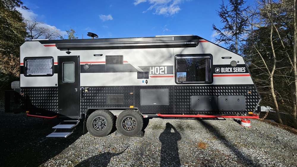This UPGRADED 2021 BLACK SERIES HQ21 is a beast of an off-road off-grid travel trailer that promises luxury and comfort on your adventures. With only ~25,000 miles, this trailer is slightly used, but still looks and functions great! This specific unit has been very high-quality, has a 15 year structural warranty and many upgrades, including 900W of solar, Lithium Batteries and Victron solar controller. The HQ21 has everything you need to feel at home on the road, off-grid or on-grid. The powerful design of the trailer turns heads wherever you go, and the durable construction is built to withstand the rigors of off-road travel.Internally, this travel trailer is very well-equipped, boasting all the amenities you need for a comfortable trip. From a fully-stocked kitchen (fridge, oven, microwave), a cozy sleeping area, a re-upholstered (with jazzy stain/pet hair resistant velvet) dinette (custom walnut) that turns to a bed, two tv's, wifi extender and a stereo system. The water system has a 3-stage water filter, and 16 gallon drinking water paired with a 28 gallon fresh water tank, each with its own water pump for redundancy and convenience. It has a tankless gas water heater, and a propane heater as well. Externally, the trailer also had a lot of features and upgrades. An upgraded super-quiet air conditioner, a massive steel rack on the back that can carry 4 jerry cans, a generator and lots of other tools. Two large storage compartments on the front, store additional tools, camping gear and two 30lb propane tanks. Below those storage compartments is a new upgraded electric jack, a backup hand jack, a hand brake system, and an 360 articulating McHitch with optional sway prevention Equal-i-zer. The electric system is upgraded as well, with a 2000 Watt inverter, 400AmpHrs Lithium Batteries, a Victron Solar Controller and 900 Watts of Solar configured in 3S3P to maximize charging in irregularly shaded spots. Stock it has two sunroofs and the large 360 degree windows are water proof (open or closed) and have very easy to use screens or reflective shades. I love these windows. The 4 large offroad tires, come with an additional two spares located on the steel cage. Outdoor speakers and the awning, make for a fun outdoor dinner party.Trailer is fully winterized. We are selling because the family has outgrown it, and we want our son (and dog) to have their own area that is not the dinette for longer trips.