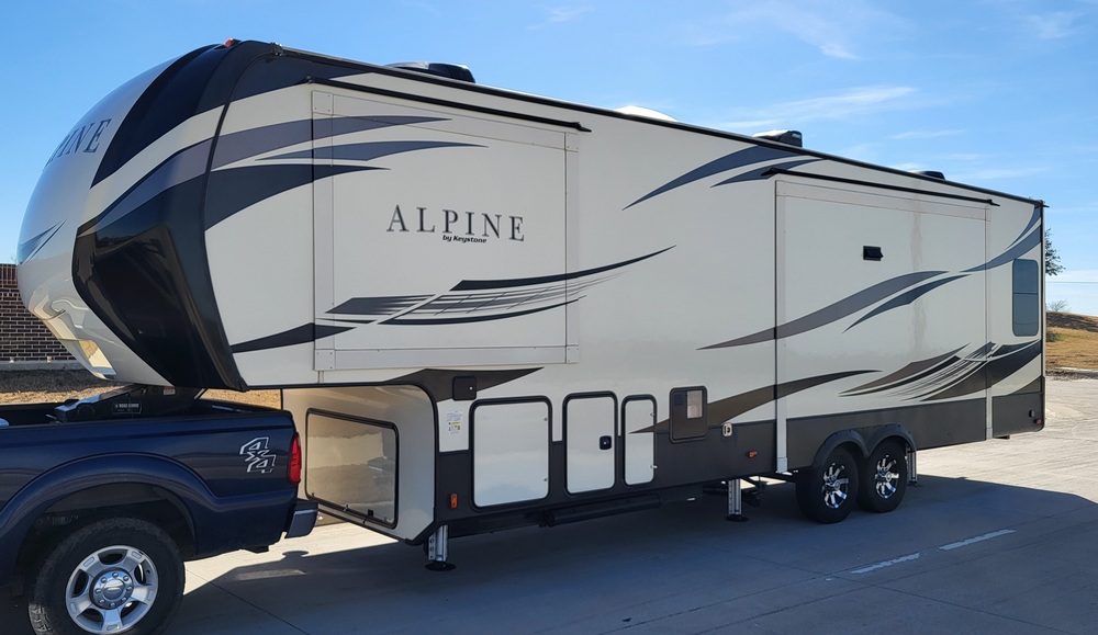 2020 Keystone Alpine 3401RS 36'4", one owner, cold weather package with heated tanks, 3 slides, 18cu ft residential refrigerator freezer, 12-gallon water heater electric or gas, In Command control system, 6-point auto leveling, replaced factory mattress, washer/dryer hookups in front closet, kitchen pantry, large belly storage, front storage, new 12V battery, 18' awning, receiver hitch. Water tank holds 66gallons, gray 83 and black tank 49 gallons.