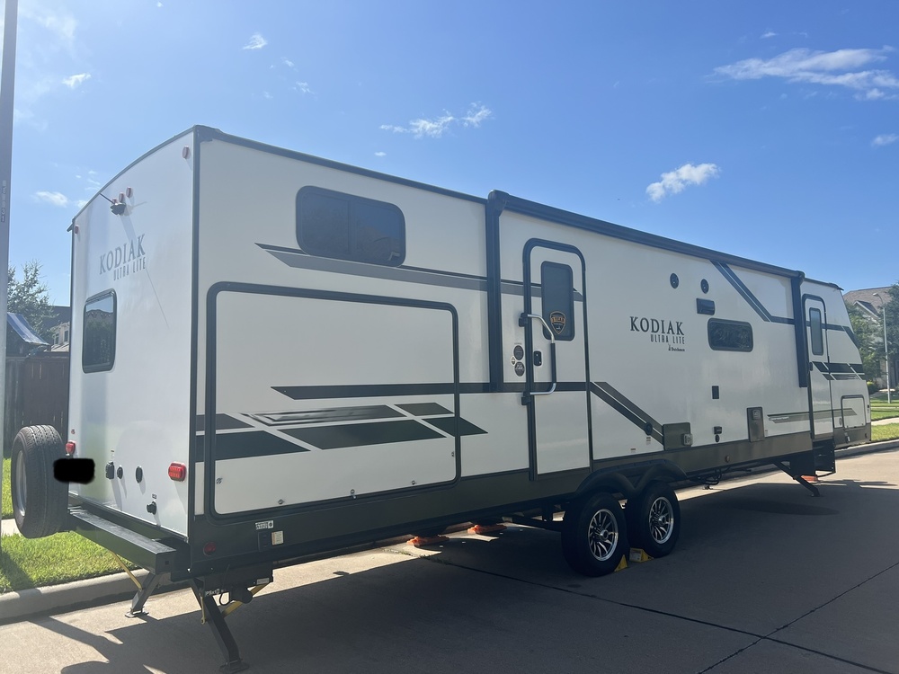 PENDING SALE. The 2021 DUTCHMEN KODIAK ULTRA LITE 332BHSL is a top-of-the-line travel trailer that offers luxury and comfort for all your camping adventures. With only 5000 miles, this trailer is practically brand new and ready to hit the road. Has been upgrades with an additional a/c unit having a total of two. Upgraded to a Ceranic toilet bowl. The spacious interior features a stylish and modern design, with plenty of room for the whole family. The living area is cozy and inviting, perfect for relaxing after a long day of exploring the great outdoors. The kitchen is equipped with high-end appliances and ample storage space, making meal prep a breeze. The pantry can fit washer and dryer and has connections. The bedroom is a private retreat, with a comfortable bed and plenty of storage for all your belongings as well as its own entry door. The bathroom is sleek and modern, with a spacious shower and all the amenities you need. Outside, the trailer boasts a large awning with LED lights, perfect for enjoying the fresh air and beautiful views. With its sturdy construction and top-of-the-line features, the DUTCHMEN KODIAK ULTRA LITE 332BHSL is sure to provide years of reliable use and unforgettable memories. Don't miss out on this incredible travel trailer - it's the perfect way to make the most of your next camping trip! Can include all tools and connections for water, electricity, and sway bar and brand new TV in the box for $1500 additional. We decided to build a pool and are no longer camping. Camper is is excellent condition.