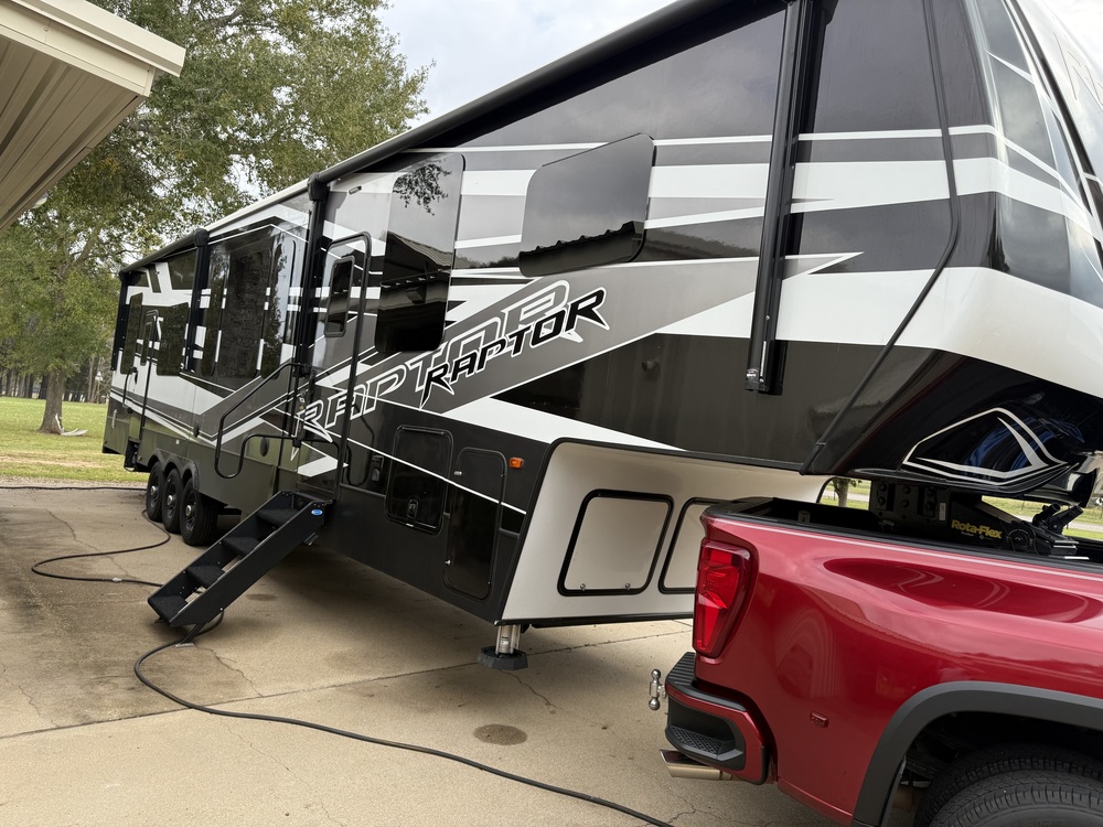 2021 Keystone Raptor 415, full body paint, 15ft garage, 1 full bath & 1 half bath, triple axle, triple slide, triple a/c’s, king master bed, full fridge, instant gas hot water heater, Onan generator, Automatic leveling jacks, non smoker owned, garage stored when not using its whole life, excellent shape inside and out.