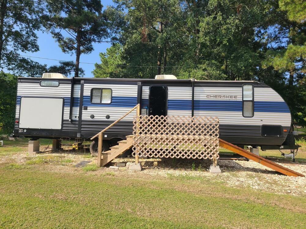 2022 Forest River Cherokee 304BH. Triple slide floorplan. Only lived in for 6 months by 1 person. Has never been moved. Stove top, oven & outside grill/kitchen never used. Queen bed, bunk beds, entertainment center, premium flooring, electric awning. The kids will love camping in this travel trailer with rear private bunk house. It features a flip bunk above a futon sofa & a bunk bed with a window & a bunk bed with storage below it. A kitchen island to make your meal prepping easier. The booth dinette is ready for you to enjoy your meals, play card games & transforms into an extra sleeping space. You can rinse off your feet at the outside shower then head indoors to take a hot shower inside with a skylight above for added lighting. Outside kitchen has 2 mini fridges, separate ice maker, sink and greystone grill. Title In Hand