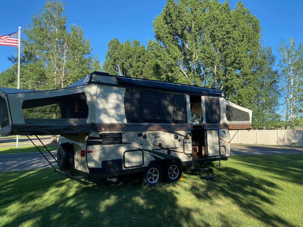 The 2018 Forest River Rockwood 296HW is a top-of-the-line pop up camper that offers comfort, convenience, and quality construction. With a spacious interior and thoughtful design features, this camper is perfect for adventurous travelers looking to explore the great outdoors without sacrificing on comfort.The Rockwood 296HW boasts a sleek exterior design with modern amenities, making it stand out among other pop up campers on the market. The large windows let in plenty of natural light, creating a bright and inviting living space. The sturdy construction ensures durability and longevity, allowing you to enjoy many years of camping trips with this reliable camper.Inside, the Rockwood 296HW offers a cozy and well-appointed interior with all the amenities you need for a comfortable stay. The kitchen comes equipped with a stove, oven, sink, and refrigerator, allowing you to prepare your favorite meals while on the road. The dinette provides ample seating for meals and can easily be converted into an additional sleeping area for guests. There is also an Air Conditioner as well as a heater.The sleeping area features a comfortable queen-sized bed, providing a restful night's sleep after a day of adventure. The bathroom includes a toilet and shower, offering convenience and privacy while camping. With plenty of storage space throughout the camper, you can easily bring along all your essentials for a successful trip.Setup is a snap with a power lift to raise the cabin, as well as a power tongue jack so there's no hand cranking required.Whether you're planning a weekend getaway or a longer road trip, the Forest River Rockwood 296HW is the perfect companion for your outdoor adventures. With its combination of quality construction, modern amenities, and thoughtful design features, this pop up camper is sure to enhance your camping experience and create lasting memories for years to come.