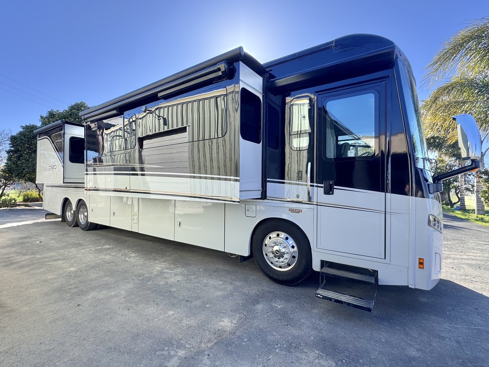 Exterior dimensions: 12 ft 9 in high, 8 ft 6 in wide, 43.25 ft longInterior dimensions: 7 ft highGross vehicle weight: 45,660 lbsTowing Capacity 15,000 lbs.Fuel capacity: 150 galFresh water capacity: 85 galGrey water capacity: 71 galBlack water capacity: 51 galEngine: Cummins ISL 8.9L Turbo Charged dieselTransmission: Allison 6-speed automaticDriveline: 4X2Floorplan: Triple slideout with a full wall slideoutSleeping: King-sized recline/incline bedSeating: Extendable sectional sofa and lounge chairDining: Glide and Dine dining table and chairsKitchen: Residential stainless steel French door refrigerator, convection cooking, two cooktop burnersBathroom: Shower with seat, 41 in x 30 inGenerator: 192.2 hrs