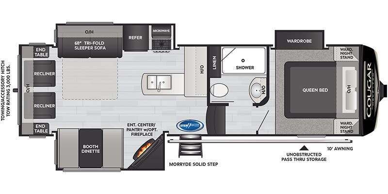 Like new 5th wheel for $39,900. 2021 Cougar 27SGS fifth wheel. One owner RV in excellent condition. We love this RV! But we are upgrading to a Class C for an upcoming trip. Length: 30.33 feet (376in.) Dry Weight: 8,046 lbs, Hitch Weight: 1,495 lbs, Tires: Aluminum wheels with NEW upgraded Hercules 14ply G-rated tires. Wheel bearings inspected yearly. Spare mounted in front storage compartment. Air Conditioners: one 15,000 BTU in the Living Room (ducted); one 13,500 BTU in bedroom. Leveling Jacks: Level Up Ground Control 3.0 auto leveling system. Slide Toppers - 3 (each slide is topped) Furnace: 35,000 BTU. Arctic 4-season Protection Package: heated holding tanks, utility center and storage bay with R-30 Floor; R-9 Walls; R-40 Roof. Fireplace in Living Room, enjoy the free heat on cooler nights. Dinette - 4 chairs. Fresh Water Tank: 60 galGray Water Tanks: 60 gal. Black Water Tank: 30 gal. Water Heater: 6 gal electric/propane with tank bypass. Propane Tanks: two 30 gal tanks. Slideouts: three total; one in bedroom (wardrobe), two in living room. Awnings: Power retractable awning with LED lights. Stove/Oven: three burner stove with oven below. Microwave: 1000w with hood fan and light. Refrigerator: 10CF Refrigerator/Freezer (Gas/Electric). Sofa: 68 Tri-fold sleeper. Recliners: 2 located at the large rear window. Entertainment System: 48 inch TV in living room, bedroom can accommodate one also; stereo system with speakers inside and outside. In-Command app: lets you control leveling, slides, awning and lights from your smartphone. Pass-through Storage outside with large amount of space. Non-smoking unit.