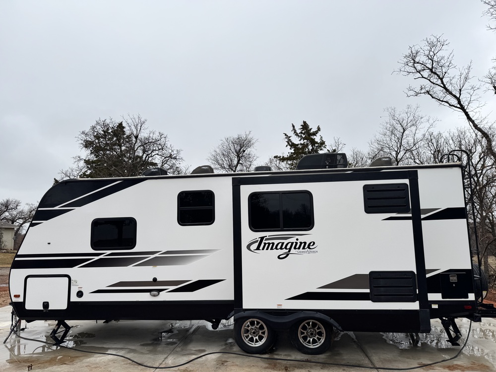 This nice one-owner, clear title 2021 Grand Design Imagine 2250RK is a top-of-the-line travel trailer with a sleek exterior and spacious interior, perfect for couples. It has been well maintained. The sofa is heated and has a vibrator with lights around the bottom. There is a sky light above the shower. The fireplace has different color choices and is thermostat controlled. Lots of cabinet storage. The large windows give good visibility to the outside.The bedroom window in the door is clear glass with a shade. Aways covered when not traveling! Specs: One slide out. Length 28 ft. Dry Weight 5724 lbs., Fresh water holding tank- 52 Gal., Grey Water - 90 Gal., Black Water- 45 Gal. Two 20 lb. Propane Tanks, 19 ft. Retractable Awning, 6 Gal. Electric/Propane Water Heater, 12 volt/ propane refrigerator. One Air Conditioner, 40" telescoping TV, Radio/DVD, Speakers- Interior/Exterior. Fireplace 1500 watts with thermostat control. Heavy-duty storage or generator rack on the rear bumper. Anti-sway weight distribution hitch. Max air vent covers.