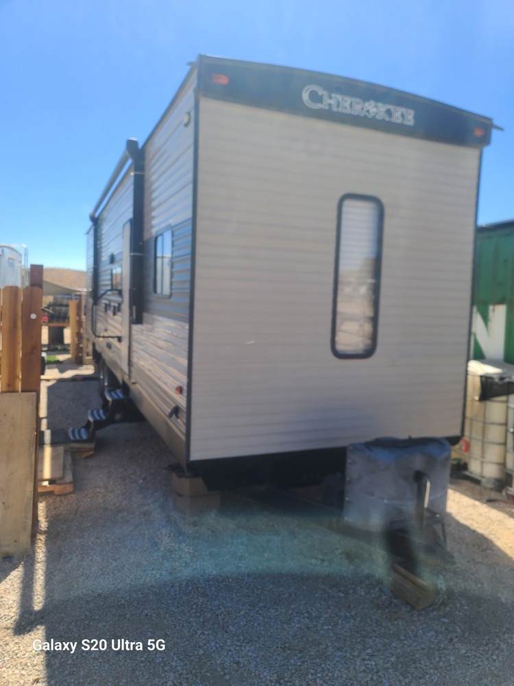 2018 Forest River Cherokee 39RESE Park Model RV. Clean inside and out with minor usage wear. Full size Fridge and Home stackable 220v washer and Dryer. The RV is a 50A 220 Volt system and plug to run the 2 air conditioners and house power. The Washer/Dryer is a separate plug to run individually of RV. You can use the RV power system if you swap Washer / Dryer for 110v system but they don't wash and dry like a household 220v system.Has large slide for table and double couch. Large Livingroom TV, Bedroom in front with trundle bed and closet. Back bedroom has Full Size/queen bed and TV.Awning hardware in good shape and electric open/close. Awning itself has been removed as worn with time.