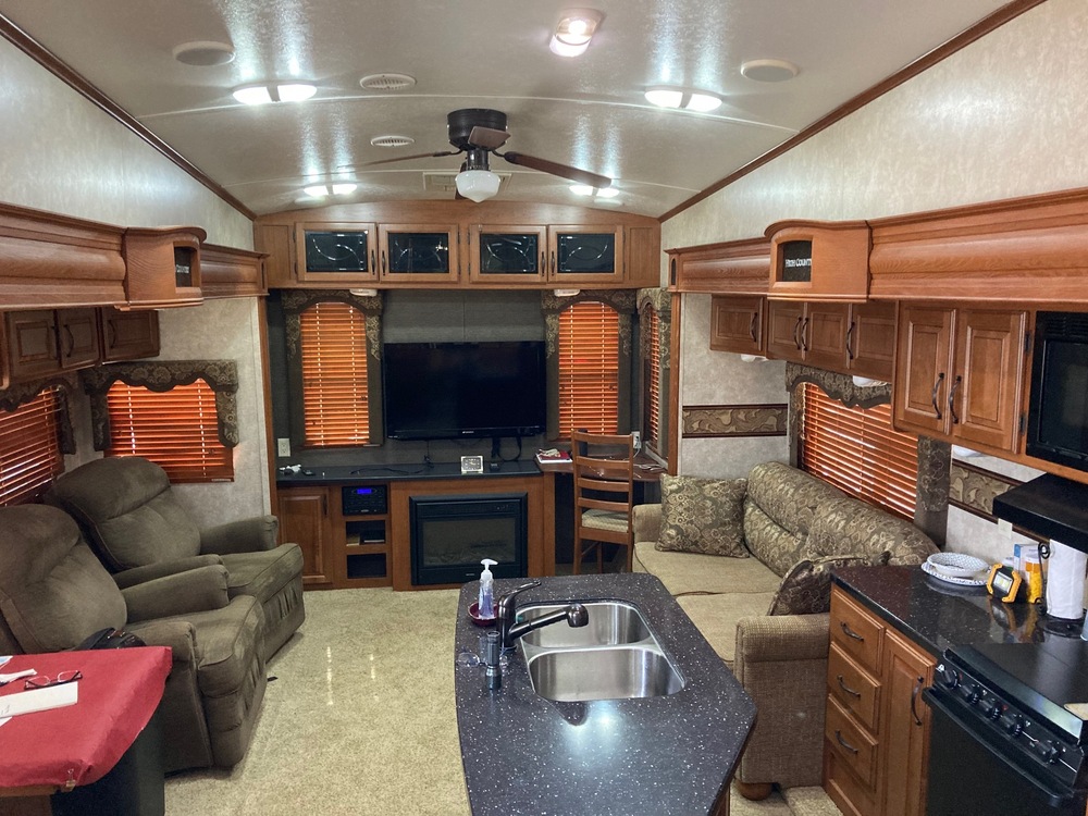 35', 318 RE floorplan. Largest 5th wheel under 9120 lbs. 4 seasons rated. In excellent cond, garage kept. 2 air units, washer and dryer hookups, floor heating and 26" electric fireplace, 2 TVs, Winegard antenna, all LED lighting, automatic awning, 3 large pop outs, 2 power roof vents, surround sound in/out w blue tooth, ceiling fan, tinted windows w blinds and window treatment, double propane tanks, double optima batteries, aluminum chassis, 6 matching wheels and tires (exc. cond.). extra-large basement storage, 30 or 50 amp service, set up for goose neck hitch (also have slide in hitch available), queen bed with underneath storage, built in dresser, full width closet, extra-large tub/shower, large 2 sided refrigerator and above 2 sided freezer, kitchen island with sink, microwave, cook top and oven, dining table with 4 chairs, 2 swivel/rocking recliners, couch, lots of basement storage and cabinets above. All receipts and documentation available.Contact Roy: 602-615-1901
