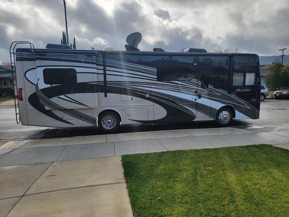 Used 2017 THOR MOTOR COACH PALAZZO 33.2 for sale. New 3 panel solar system, AGM batteries, Direct TV HD auto dish, 2-Receivers, 1-Sony Bravia HD TV w/Bose sound bar, 2-Samsung Smart TV's, Front tires have safety bands installed in tires for safety during a Front Tire Blowout.