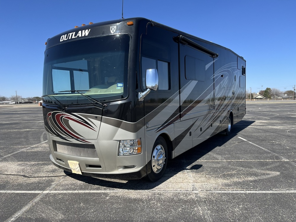 2016 Thor Motorcoach Outlaw 37RB ToyHauler, 10 ft garage, sleeps 10, new tires,3 outside canopies, 5 TVs, on board generator, patio , outside TV and stereo, fueling station, well kept and very clean. Ready for your side by sides or motorcycle