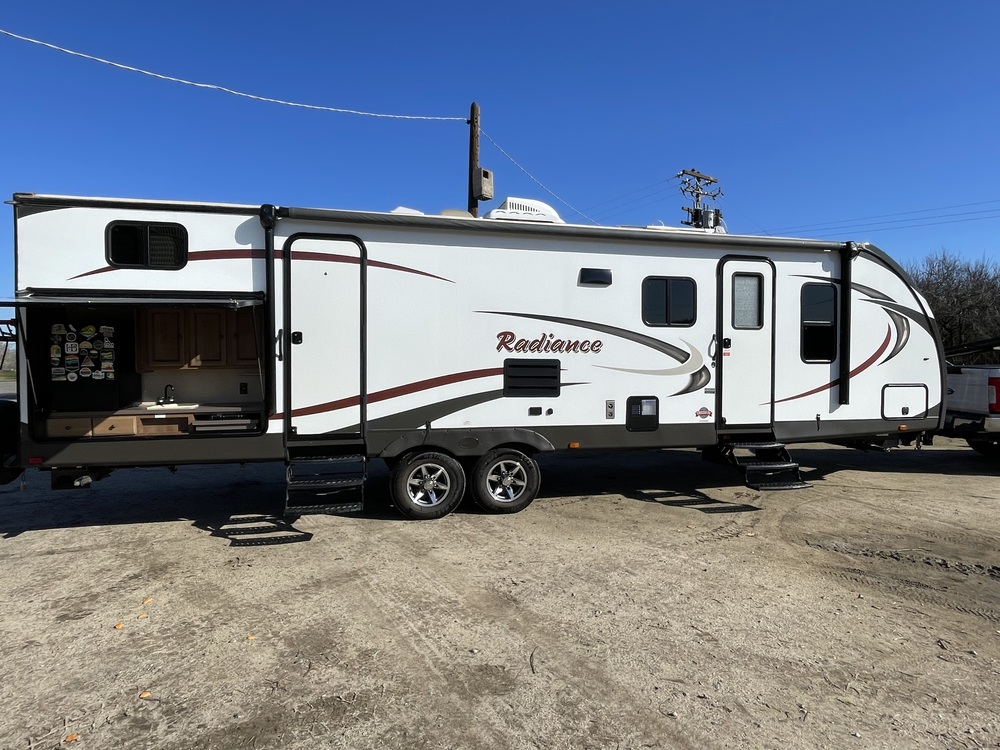 Outside is like new its been stored in enclosed shop when not traveling. Never been lived in! Sleeps 8 comfortably! This 31DSBH is a spacious travel trailer that is perfect for family vacations or weekend getaways. The outdoor kitchen is one of our favorite features. It comes with a mini fridge, outdoor sink, two burner stove, and lots of storage. There are two entry doors. One to the main living/ kitchen area, the other to the bathroom. The master bedroom has a cozy sleeping area with a queen-sized bed and plenty of storage. The living room couch has been recently upholstered and folds into a couch bed. The booth can also be folded down for more sleeping areas. The bunkhouse has two twin top bunks and a couch that folds into a queen bed area. Added bonus: We added a Kurt hitch so we could mount a bike rack. (Bike rack is not included).