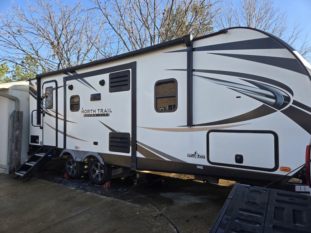We are selling our 2020 Heartland North Trail 23RBS Travel trailer. My wife and I have loved this trailer for 4 years now but are moving on to a little bigger rig. What attracted us to this trailer is the king size bed, opposing slide outs and the island kitchen. For a 23-foot trailer, the dual slides in the middle really opens up the space.