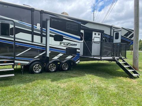 The Keystone Fuzion 424 is a top-of-the-line toy hauler trailer for the 2021 model year. Designed to provide the ultimate in luxury and convenience for your outdoor adventures, this model is perfect for those looking to take their toys on the road in style. With a sleek and modern design, the Fuzion 424 is sure to turn heads wherever you go.The interior of the Fuzion 424 is spacious and well-appointed, with high-end finishes and top-of-the-line amenities. The living area is designed for comfort, with plush seating, a large screen TV, and a cozy fireplace. The kitchen is fully equipped with stainless steel appliances, solid surface countertops, and plenty of storage space. The bedroom features a comfortable queen-sized bed and plenty of closet space for all of your belongings.One of the standout features of the Fuzion 424 is its large 13 Ft garage area, which is perfect for storing ATVs, motorcycles, or any other toys you want to bring along on your adventures. The garage is equipped with tie-downs and a ramp door for easy access, making it simple to load and unload your toys.In addition to its luxurious interior, the Fuzion 424 is also equipped with a number of exterior features to enhance your camping experience. These include Onan 5500 watt generator, side and back patios with 3 power awnings, and plenty of storage space for all of your gear.Overall, the Keystone Fuzion 424 is a top-of-the-line toy hauler trailer that offers unbeatable luxury and convenience for your outdoor adventures. Whether you're hitting the trails with your ATVs or heading to the lake with your jet skis, the Fuzion 424 has everything you need to make your trip unforgettable.
