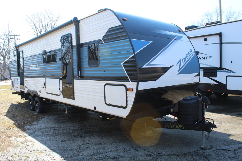 Granite Gray décor, Front bedroom with queen bed, rear bunkhouse with slide out has 5 single bunks, jack knife sofa/trundle mattress, kitchen has 12 volt fridge, 3 burner stove/oven, u-shaped dinette booth and jack knife sofa, ZINGER Z-LOUNGE in slide out, electric fireplace, round shower in bathroom with outside entry door, on demand water heater, 15k btu A/C, 50 amp service, 2nd 13.5k A/C in bunkhouse, 2 slide outs, power awning, slide out toppers on both slide outs, 100W Solar panel, outside kitchen, power stabilizer jacks, power tongue jack, 2 entry doors with windows, sleeps 12