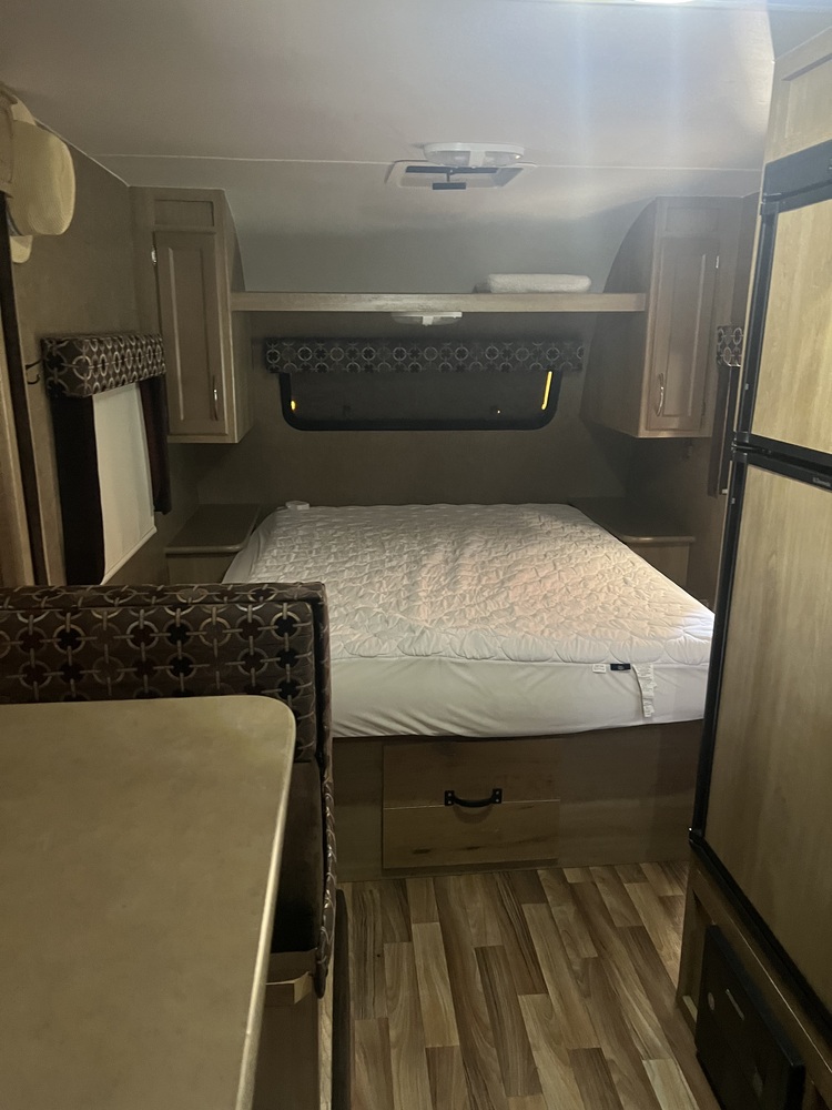 Nice clean unit. Solar on roof for batteries. Power hitch. sleeps 4. 1 slide for dining room couch. Very light easy to tow.