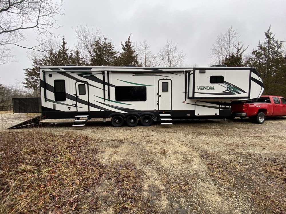20’ garage toy hauler for sale. 2017 model. Will sleep eight. Large bathroom. Needs a new awning fabric on one of the awnings. Two slide outs. Generator. Double door refrigerator. Automatic hydraulic leveling jacks. Washer/dryer hookup.