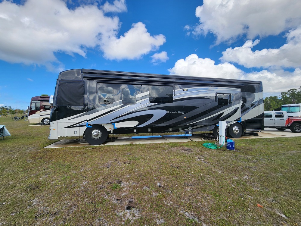 This coach has a lot of extras: a Dometic fridge in the basement on a slide out tray, in-floor heating, pass-thru slide tray accessible from each side and power MCD Day/Night shades. We are including Magne-Shade covers for the windshield, driver's window and passenger window along with tire and wiper covers, heavy-duty levelling pads, an adjustable step and the Blue Ox tow bar, as well as a Tow Defender to protect your toad from taking the hit from road junk!