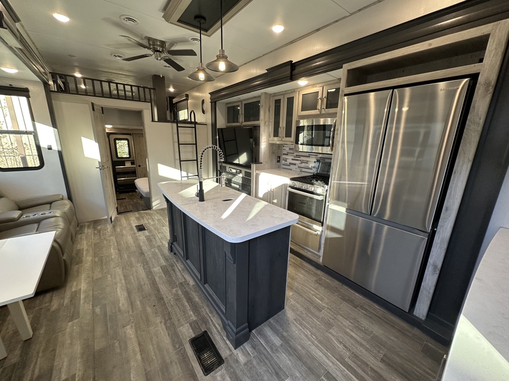 This 2022 Avalanche 390DS has a Hydraulic Landing Gear, 3 Slide-outs, 2 Ducted Air Conditioners, 110v Residential Samsung Refrigerator, In-Fridge Ice Maker, Automatic Main Awning And Slide Awning, Washer/Dryer, Outside Speakers, 3 TVs, Outside Shower, Fireplace, Central Vacuum, Microwave, 3 Burner Range, Oven